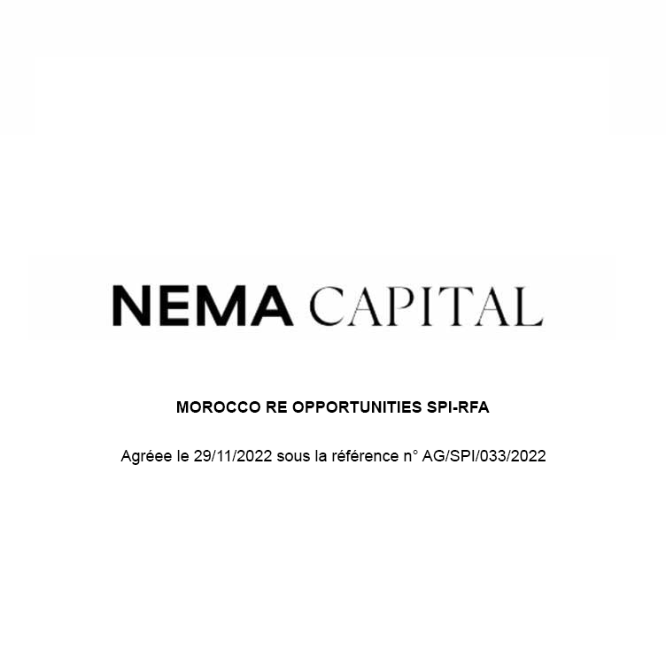 Nos actualités COMMUNIQUÉS NEMA CAPITAL informe… LIRE LA SUITE COMMUNIQUÉS NEMA CAPITAL informe… LIRE LA SUITE COMMUNIQUÉS NEMA CAPITAL informe… LIRE LA SUITE COMMUNIQUÉS NEMA CAPITAL obtient l’agrément… LIRE LA SUITE GUIDES Guide sur les OPCI par l’AMMC.. LIRE LA SUITE LÉGISLATION Loi relative aux OPCI.. LIRE LA SUITE COMMUNIQUÉS Nomination du nouveau Directeur Général.. LIRE LA SUITE Vous souhaitez en savoir plus sur les OPCI ? EN SAVOIR PLUS Nous contacter SIEGE SOCIAL 55, Boulevard Abdelmoumen. 20100 Casablanca. En cochant cette case, vous acceptez que vos données à caractère personnel collectées soient utilisées à des fins de prospection directe. Conformément à la loi 09-08, vous disposez d’un droit d’accès, de rectification et d’opposition au traitement de vos données personnelles. Ce traitement a fait l’objet d’une demande d’autorisation auprès de la CNDP sous le numéro A-GC-862/2023